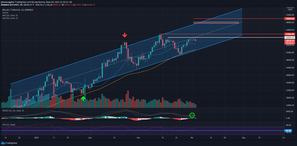 Uzun vadede yükselen kanal içinde bulunan ve hem 60.000 dolarlık psikolojik dirençle hem de yükseliş kanalının orta bandıyla karşı karşıya kalan BTC’de yaşanan gerilemeyle birlikte piyasa hakimiyeti de 58 seviyesinden 59’a doğru yükselişe geçti. Olası bir düzeltmede 20 günlük hareketli ortalama olan MA20 (56.614 Dolar) seviyesinin fiyata destek olacağı belirtilirken yayın saati itibariyle BTC 58.300 dolar civarından alıcı buluyor.