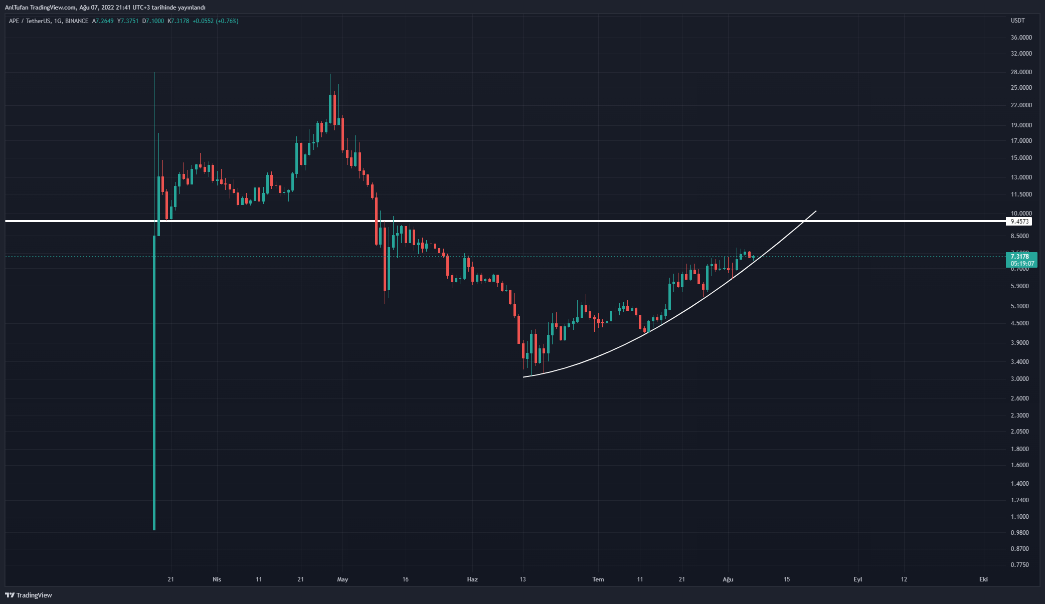 Haberimizin yazıldığı esnada 7.31 dolar seviyelerinden işlem gören APE, bir süredir yükseliş yaşamaya devam ediyor. Güzel bir parabolik trend oluşturan ApeCoin, ilerleyen günlerde 9.45 dolar seviyelerine ulaşması bekleniyor.