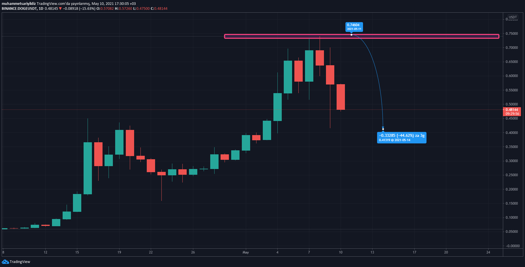 DOGE, 0,74 dolara kadar yükseldikten sonra Saturday Night Live programının bitmesi ile 0,416 dolara kadar çakıldı. Daha sonra toparlanan ve 0,59 dolar seviyesinin üstüne çıkan DOGE, bazı isimlere göre ise 1 doları test etmeyi her halükarda deneyecek.