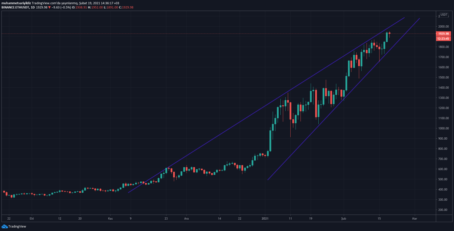 Günlük grafiğe bakıldığında ise yükseliş hattının devam ettiği ve 2.000 doların kırılması gerektiği görülmekte. Aksi durumda ETH’nin fiyatı düşüş eğilimi gösterebilir. 1880 dolar seviyelerinde önemli desteği bulunan Ethereum’un boğalarca destekleneceğine kesin gözüyle bakılmakta.
