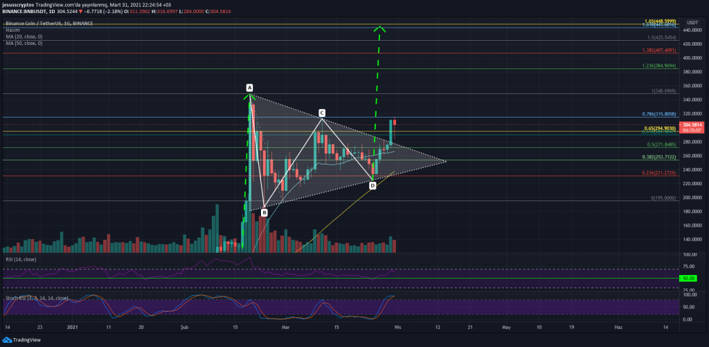 Bu formasyonun başlangıcında oluşan yükseliş mumları ise kırılım sonrasında gerçekleşmesi beklenen hedefi gösteriyor. Yani şimdilik 300 dolar üzerinde bulunan BNB’nin BTC’nin ters bir hareket yapmaması durumunda kademeli bir şekilde ileriki günlerde takribi olarak 450 dolar bandına kadar yükselmesi bekleniyor.