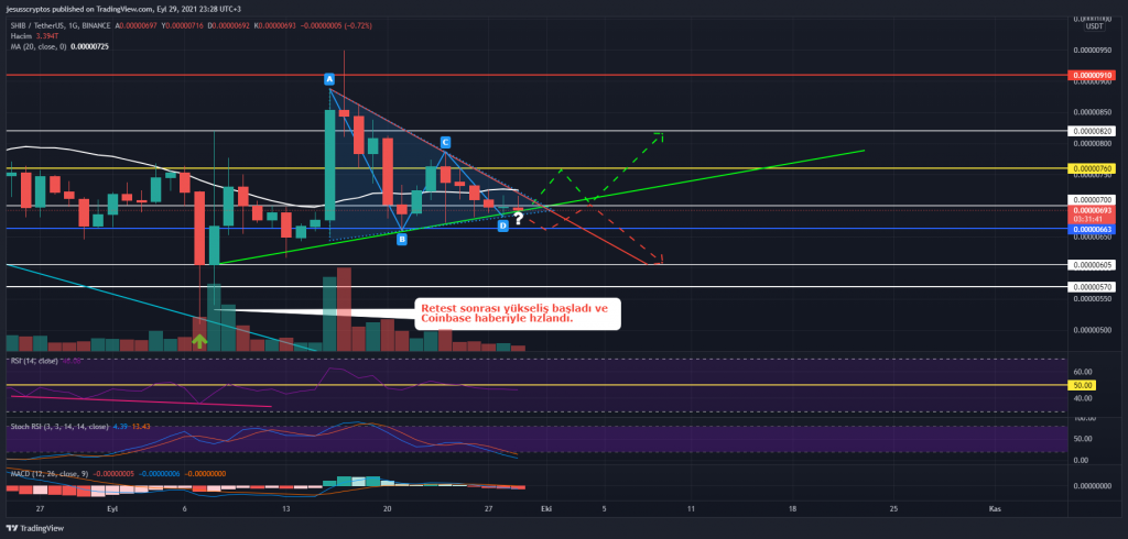 Bu düşüş sonrası 20 günlük hareketli ortalama altında kalan SHIB’in günlük grafik üzerinde simetrik üçgen formasyonu oluşturduğu görülüyor. Üçgenin sonuna geldiği görülen fiyatın hangi yöne kırılım yapacağı ise merak konusu oluyor.