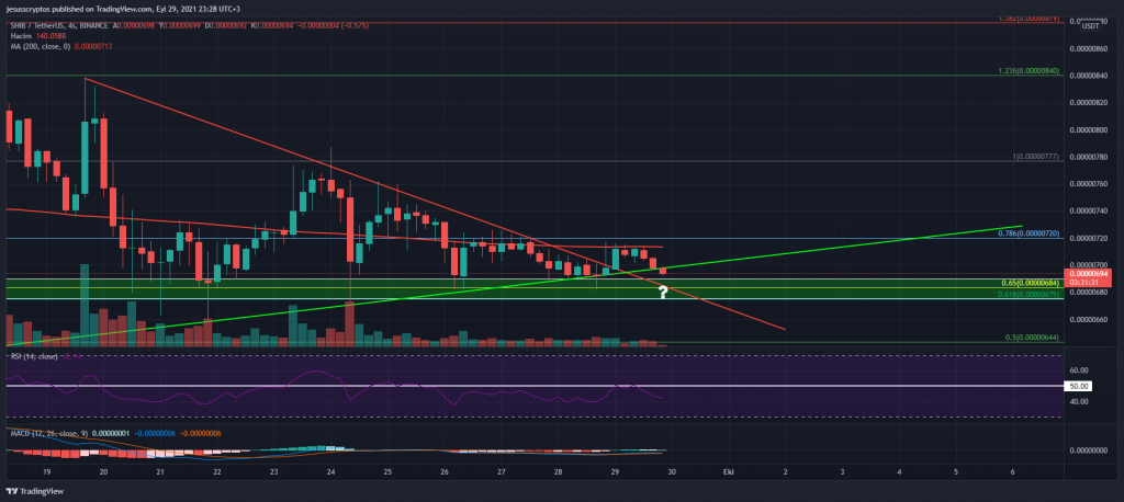 4 Saatlik grafikte de hacim tarafında ve RSI göstergesinde durumu kötü olan SHIB, 0,00000675 – 0,00000690 dolar aralığındaki yeşil destek bölgesine doğru sarkıyor.