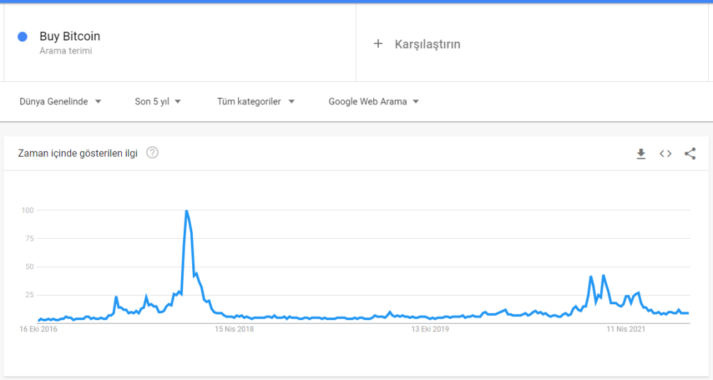 Aşağıda gördüğümüz “Buy Bitcoin” araması yıl içinde en düşük 8 seviyesini görürken güncel olarak 9 seviyesinde bulunuyor. Bu durum Bitcoin aramalarıyla uyuşurken akıllara son fiyat artışlarının nasıl olduğu geliyor.