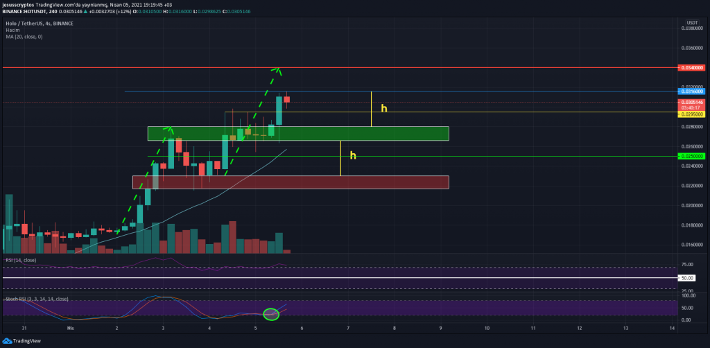 Son 24 saatte %15’lik bir yükseliş yaşayan HOT, yayın saati itibariyle açılan yeni 4 saatlik mumda (19:00) 0.0316 dolarlık dirençten satış baskısı yiyor.