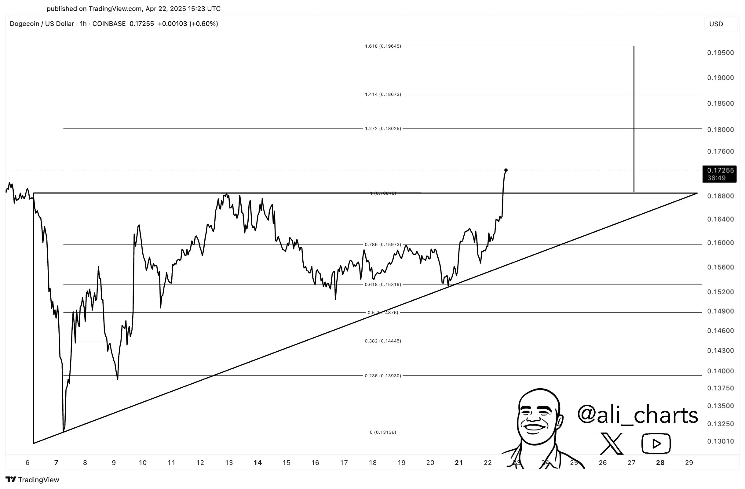 Ali Martinez son raporunda, “Dogecoin (DOGE), yükselen bir üçgen formasyonundan çıkış yapıyor gibi görünüyor ve bu formasyonun hedefi 0,195 dolar olabilir!” sözlerini aktardı.