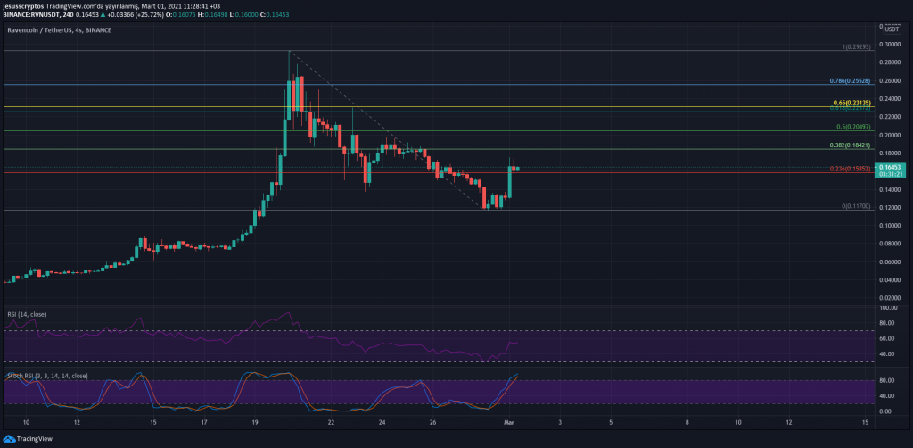 Ravencoin için her şey pozitif görünüyor ama bu demek değil ki geri çekilmeler olmayacak. Fiyatta zaman zaman gerçekleşecek olan geri çekilmeler yükselişin daha sağlıklı olmasını sağlayacaktır. Ayrıca 4 saatlik grafikte Fibonacci düzeltmesi uygulandığında, 0.158 dolarlık seviyenin güzel bir destek oluşturduğu görülüyor.