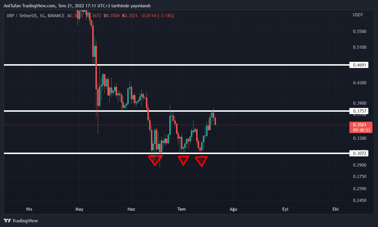 Kritik bir direnç noktası olan 0.3757 doları aşmayı başaramayan XRP, tekrardan geri çekilmeye başladı. İlerleyen saatlerde düşüşlerin devam etmesi halinde ise okurlarımız 0.3072 dolar desteğini takip etmeleri gerekmekte.