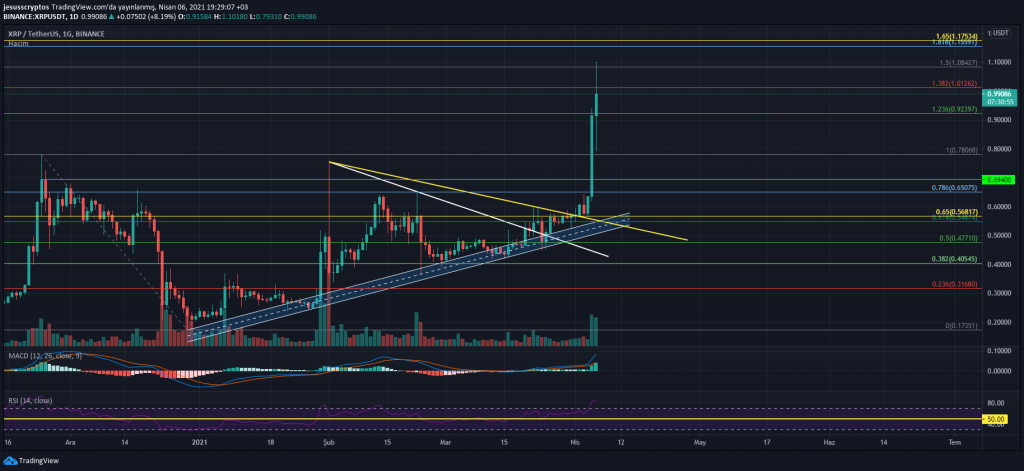 Bir önceki XRP analizimizde günlük grafikteki düşüş trendini yukarı yönlü kıran fiyatın bir hafta gibi kısa bir sürede %100’ün üzerinde yükseldiği görülüyor. Son 24 saat içinde %77 yükselen ve oldukça dik bir mum oluşturan XRP’de teknik anlamda günlük grafiğin biraz yerine oturması beklenebilir. Şu birkaç gün fiyatın yükseliş yaşadığı bu yeni alanda fiyat keşfi yapacağı düşünülüyor.