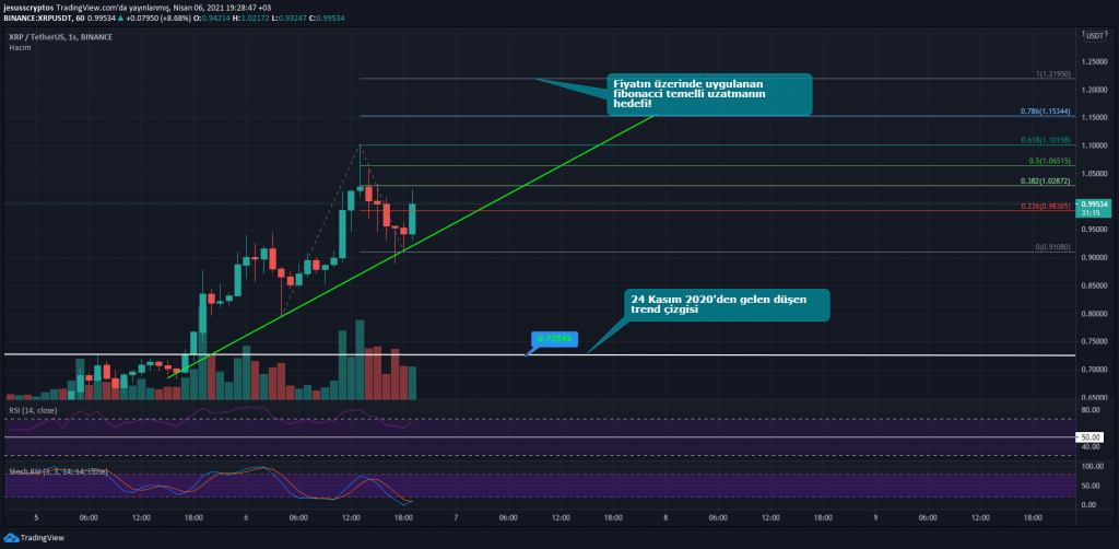 Uygulanan bu fibonacci aracının XRP fiyatında yeşil çizgi altına bir gerileme ya da 0 noktası olan 0.9108 dolar altına inmediği sürece hedefin 1.219 dolar olduğu belirtiliyor. Buna göre bu seviyeler altında kısa vadeli ve bu formasyona uymak isteyen yatırımcılar stop olmayı tercih edebilir. Ayrıca StochRSI göstergesinin de bu yükselişi desteklediği görülürken yazım sırasında fiyat yükseliyor.