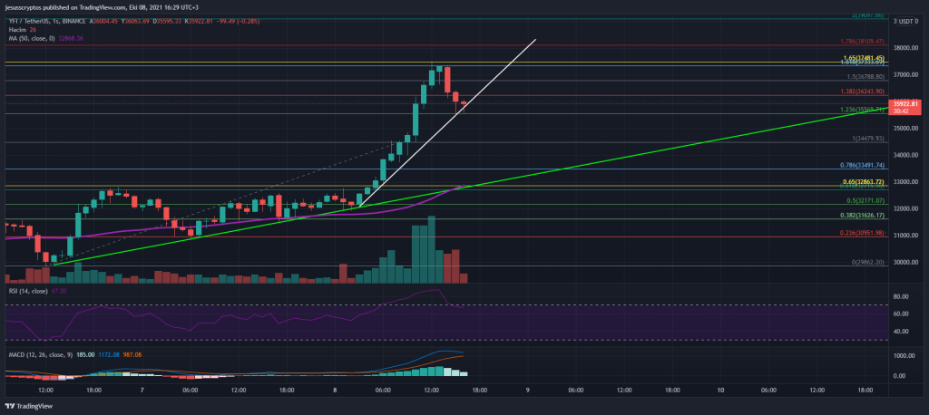 Bugünün mumunda %16’lık bir yükseliş gören YFI yaşadığı %5’e yakın gerilemeyle 35.569 dolar desteği üzerinde tutunmaya çalışıyor. Saatlik grafik üzerinde çizilen beyaz yükseliş trendini aşağı yönlü kırmaya çalıştığı görülen YFI’nın yatay destek üzerinde devam etmesi halinde tekrardan 37.481 direncini denemesi bekleniyor. Ancak yatay destek kırılırsa fiyatın MA50 seviyesine ve aynı zamanda diğer yükselen trend olan yeşil çizgiye denk gelen 32.868 dolara kadar düştüğü görülebilir. Bu noktada MA50 altındaki kapanışlarda stop olma yoluna gidilebilir.