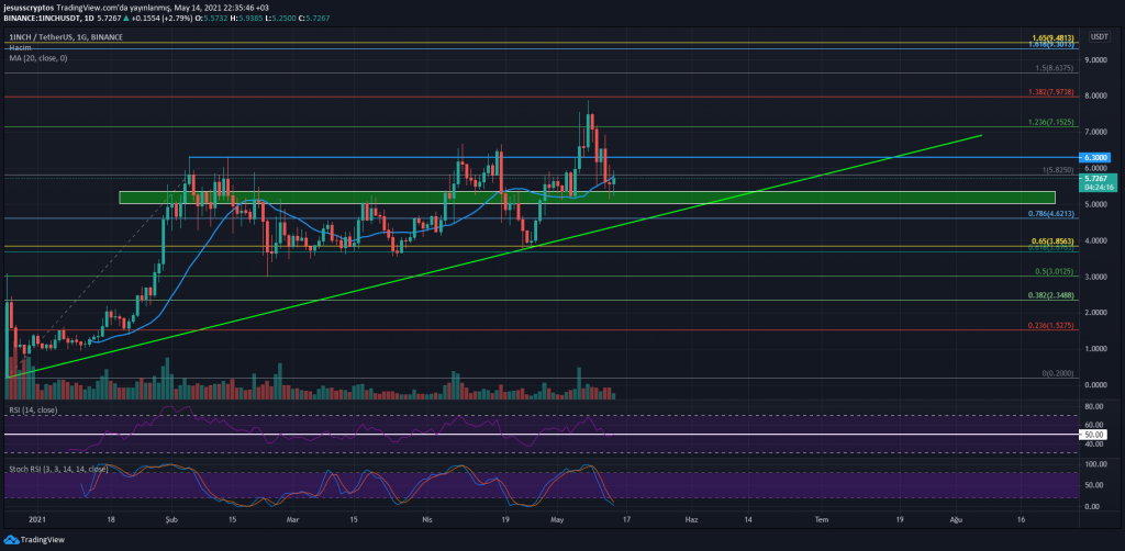 Teknik anlamda genellikle trendler için önemli olan unsurlardan biri olan 20 günlük hareketli ortalamaya (MA20) denk gelen 5.782 dolar altında seyreden 1inch, yükseliş için bu seviye üzerinde günlük mum kapanışları yapması gerekiyor.