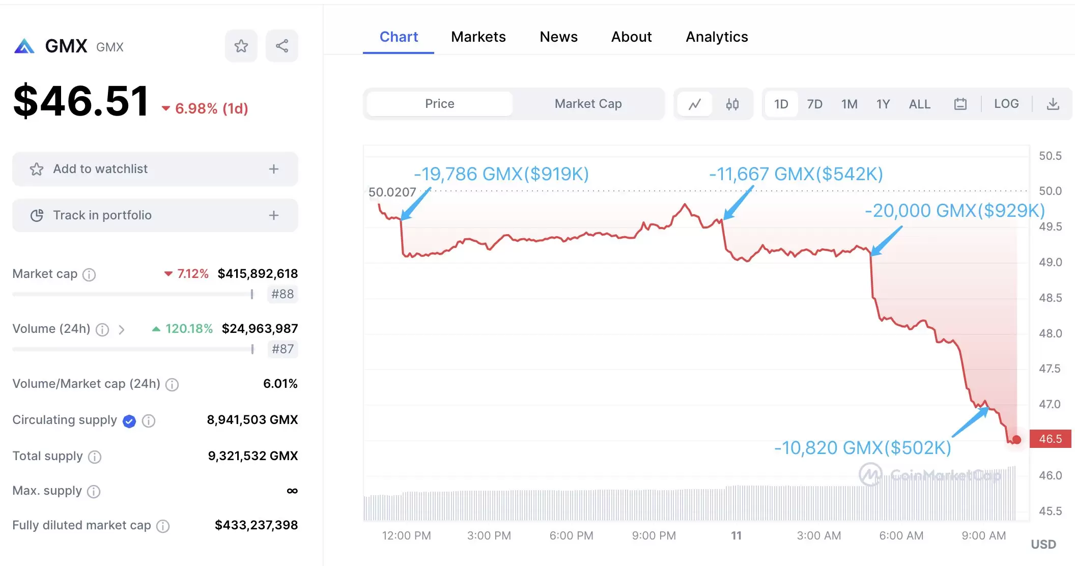 “Son 24 saatte 4 balina toplam 62.274 adet GMX (3 milyon dolar değerinde) sattı ve bu da GMX’in fiyatını %7 düşürdü.”