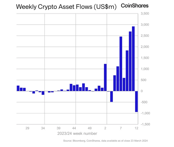 Başarılı bir analitik şirketi olan CoinShares’in aktardıklarına göre 7 hafta sonra ilk kez kripto fonlarından para çıkışı oldu. Geçtiğimiz haftadaki toplam para çıkışı 942 milyon dolar oldu.