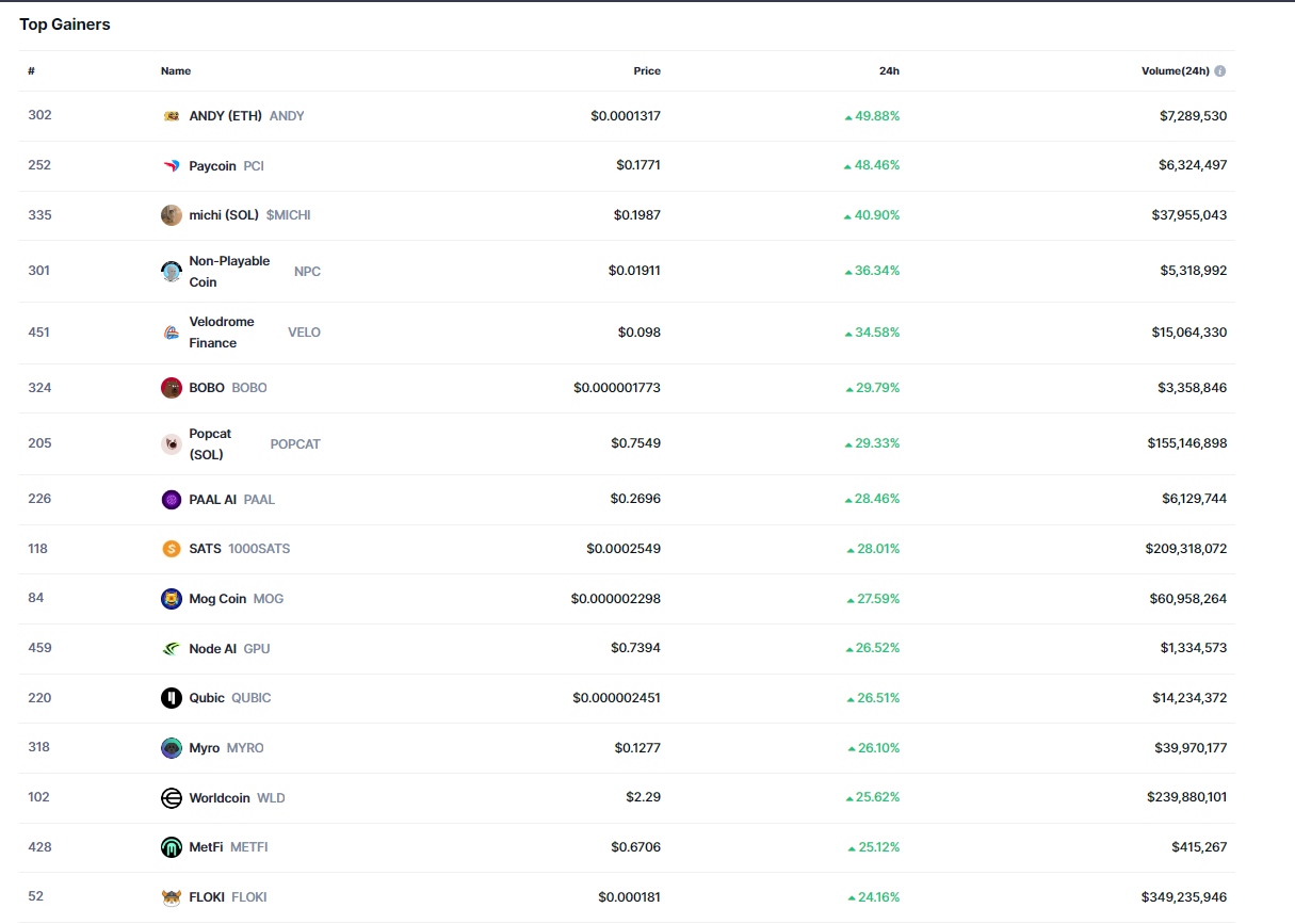 ANDY haricinde sırasıyla PCI, MICHI, NPC, VELO, BOBO ve POPCAT‘te %30’dan fazla değer kazanmayı başardı.