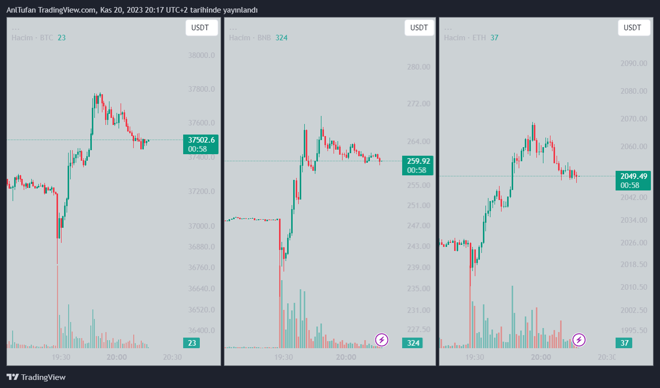 Bu gelişmeler ışığında lider kripto para birimi Bitcoin (BTC) 37.800, lider altcoin Ethereum (ETH) 2.070 ve Binance’in yerel kripto para birimi BNB ise 270 dolar seviyelerine kadar bir yükseliş yaşadı.