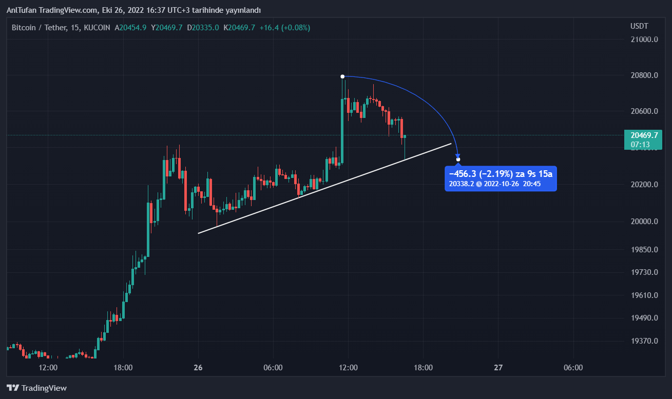 Bitcoin’in dakikalar içerisinde yüzde 2’lik bir düşüş yaşadığı görüldü. Minor yükselen trendinden tepki almayı başaran BTC, ilerleyen saatlerde 20.350 dolar desteğini kaybetmemeli.
