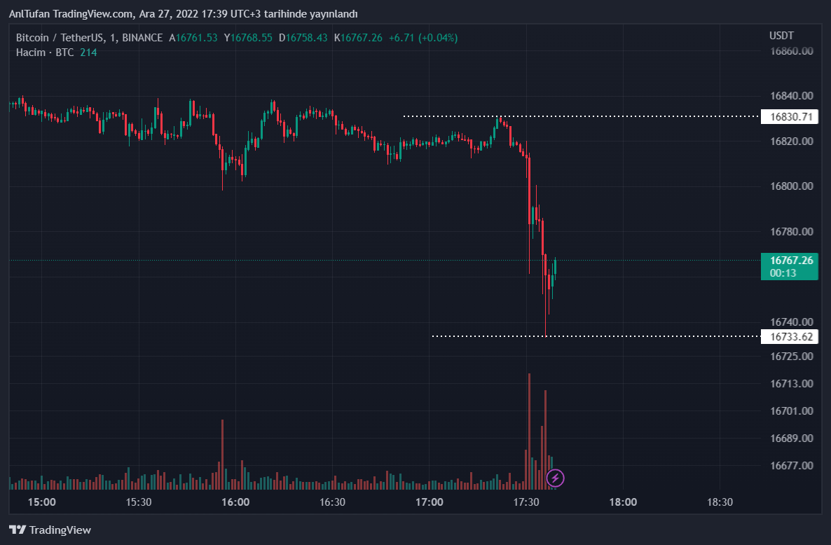 Kısa bir süre içerisinde 16.730 dolar seviyelerine kadar gerileyen BTC, ilerleyen saatlerde 16.600 dolar seviyelerine düşüş yaşaması beklenmekte.