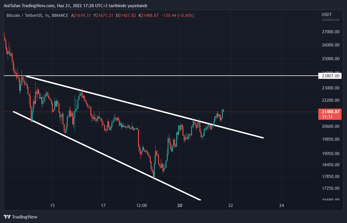 Haberimizin yazıldığı esnada 21.500 dolar seviyelerinden işlem gören lider kripto para birimi, minor düşen trendinin üzerinde konumlanıyor.