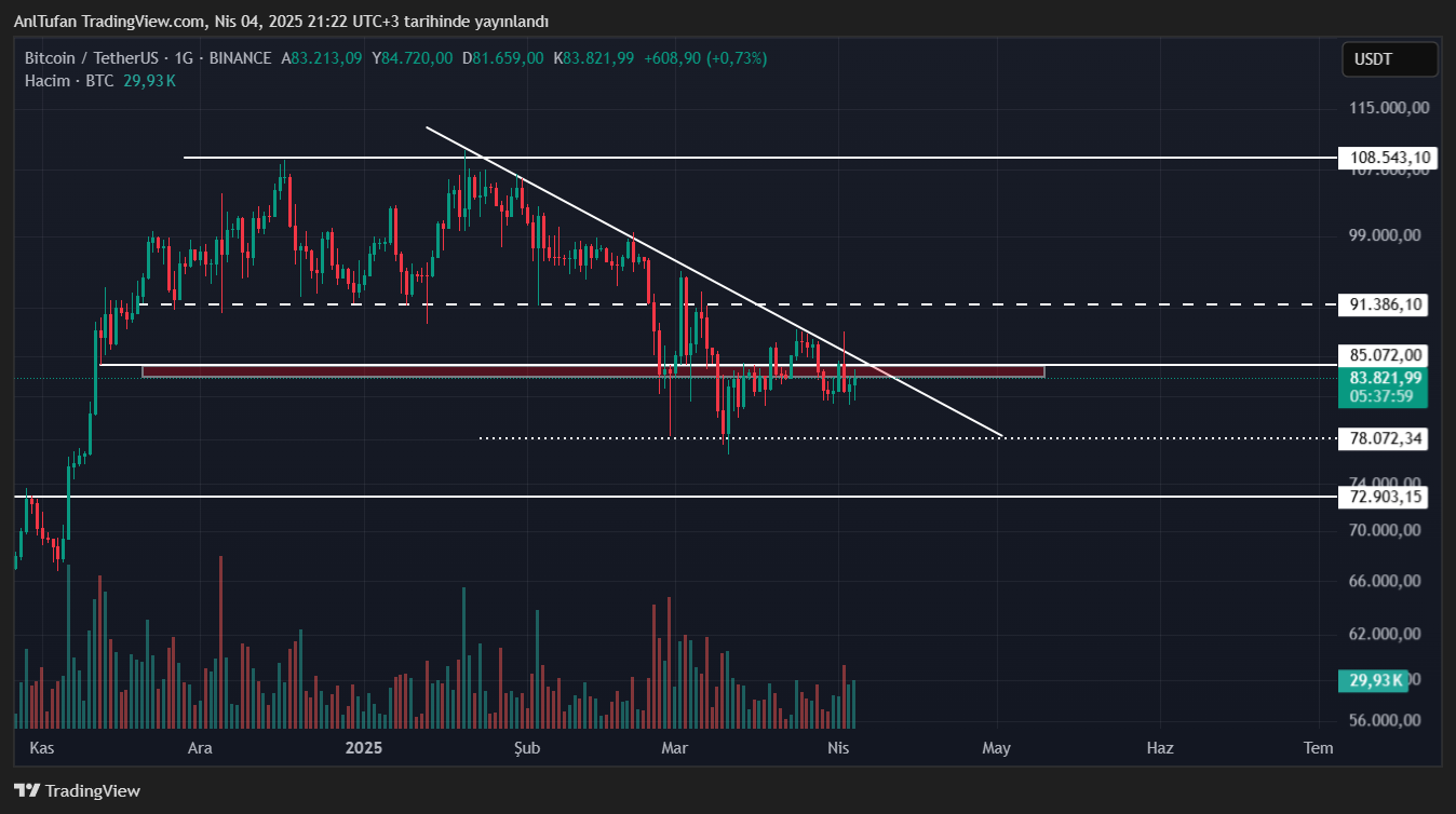 Bitcoin (BTC) haberimizin yazıldığı esnada 83.800 dolardan işlem görüyor. ABD borsalarındaki çöküşe rağmen son 2 günde yükseliş yaşayan BTC, kritik bir noktada konumlanmakta.