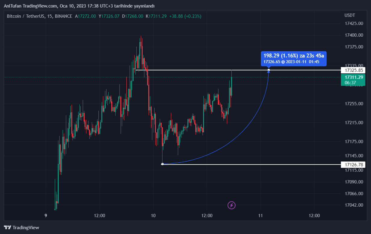 Şuan itibariyle lider kripto para birimi Bitcoin’in de (BTC) yükselişe geçtiği görülebiliyor. ABD borsalarının günlük mumlarının yeşile dönmesinin ardından 17.325 dolara kadar yükselen BTC, bu direnç seviyesini aşmakta zorlanmakta.