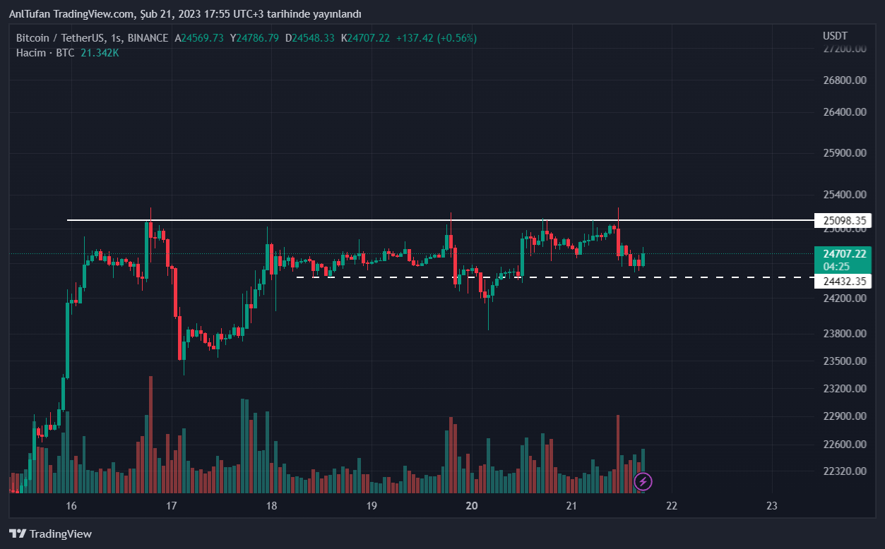Lider kripto para birimi Bitcoin (BTC), son dönemlerde olduğu gibi yine 24.500 – 25.250 dolar aralığında akümüle oluyor. Günün erken saatlerinde her ne kadar BTC bir direnç denemesi gerçekleştirmiş olsa da, kritik direncin yine kırılamadığı görüldü.
