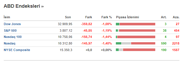 TSİ 17.30’da satıcılı bir şekilde açılan ABD borsaları, dakikaların ilerlemesiyle birlikte çok daha sert düşüşler yaşadı. Şuan itibariyle ABD endekslerine günlük kayıplar yüzde 1’i aşmış durumda.