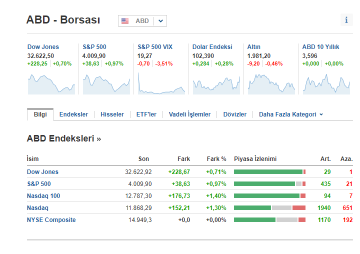 Son ABD borsa verilerine baktığımızda, ABD’nin en büyük teknoloji endeksi olan Nasdaq yüzde 1’den fazla yükseliş yaşamayı başardı. SP 500 ve Dow Jones‘un a bullish hamleler sergilemesi dikkat çekiyor.