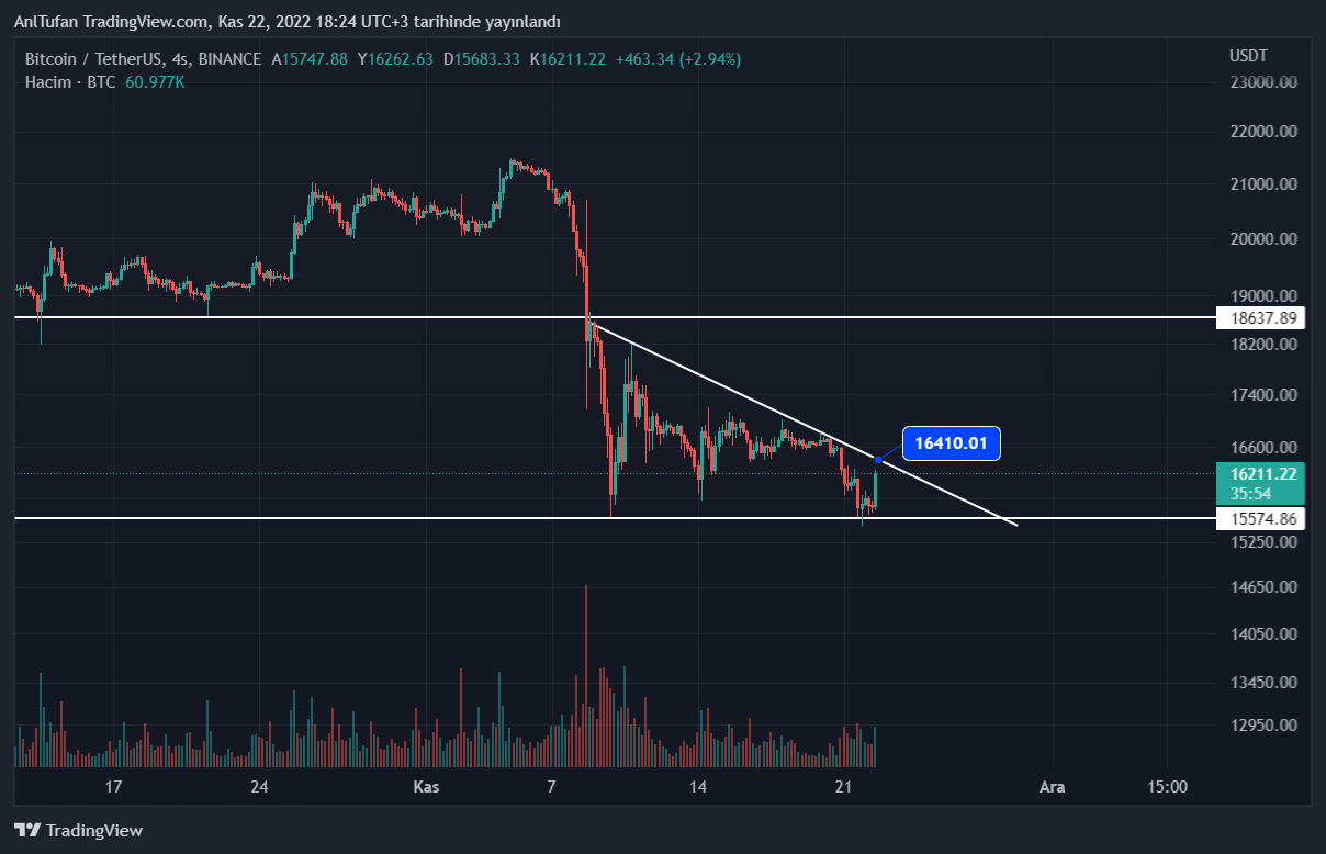 Bitcoin’in dip bölgeden aldığı tepki ile birlikte düşen trend noktası olan 16.400 dolara doğru yükselişe geçtiği görülebiliyor. Her ne kadar halen düşen trend kırılmamış olsa da, BTC ilerleyen saatler için olumlu sinyaller vermekte.