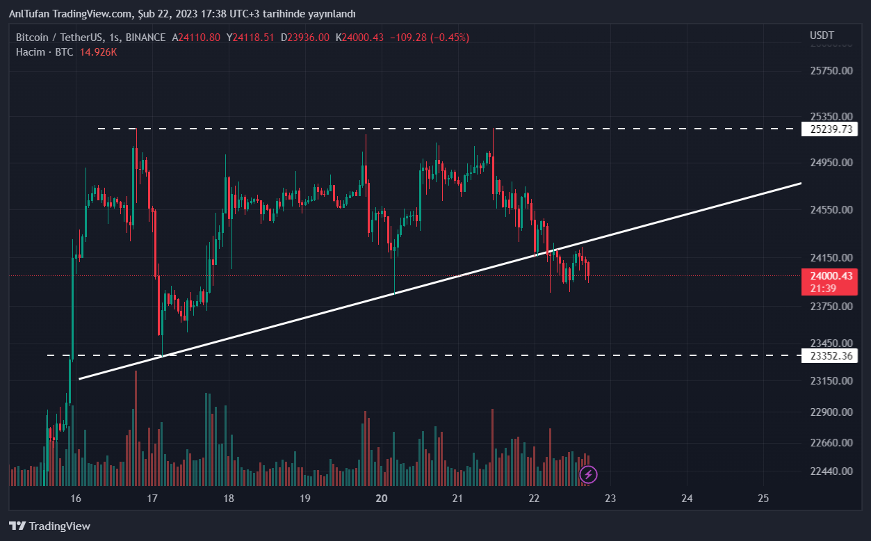 Haberimizin yazıldığı esnada Bitcoin 24 bin dolar seviyelerinden işlem görüyor. Şuan itibariyle 23.850 dolar ara desteğinde tutunmuş gibi gözüken BTC, bu destek noktasını kaybetmemesi gerekiyor.