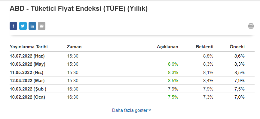 Başarılı bir veri sağlayıcısı olan Investing’in aktardıklarına göre, ABD’de enflasyon oranlarında beklentinin yüzde 8.8 olduğu görülüyor.