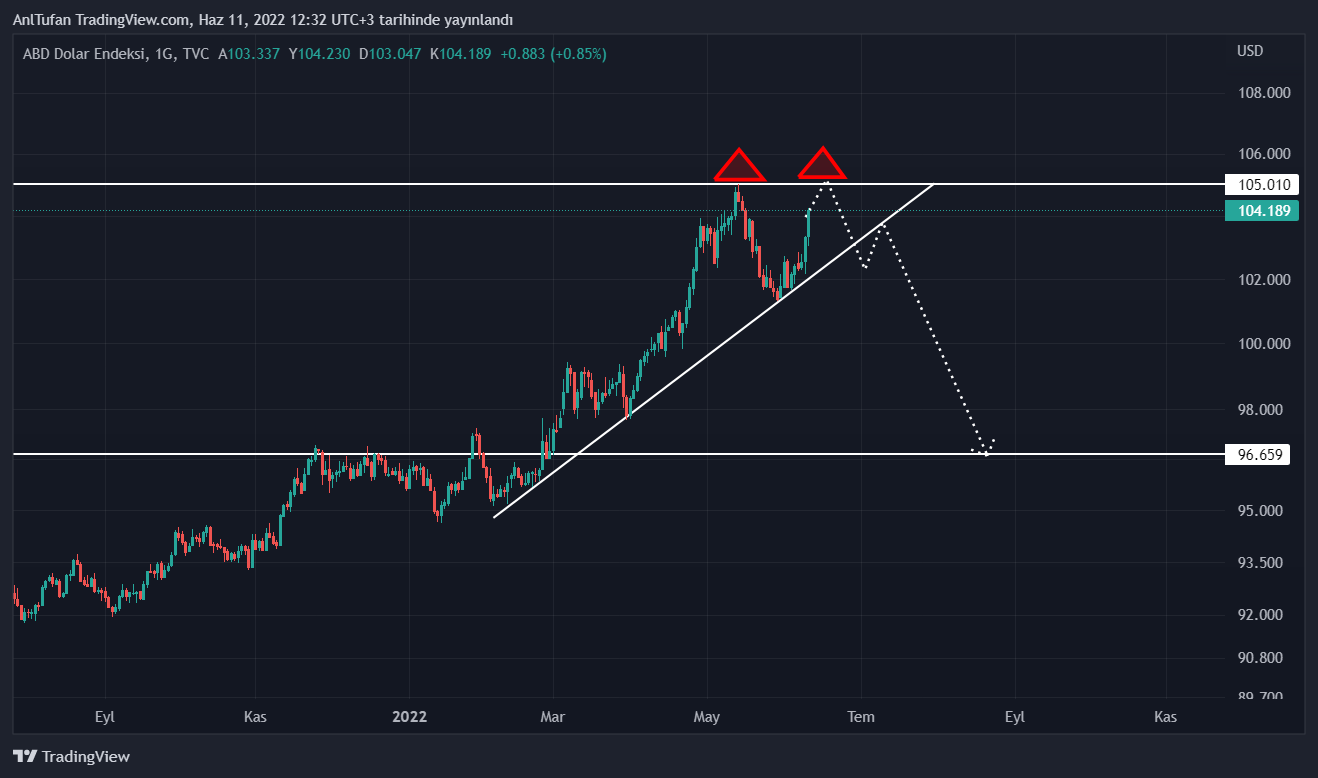 An itibariyle kritik bir direnç seviyesi olan 105 puana yaklaşan DXY, bu seviyelerden sert bir reddedilme yaşaması halinde 2’li tepe formasyonu oluşturacak.