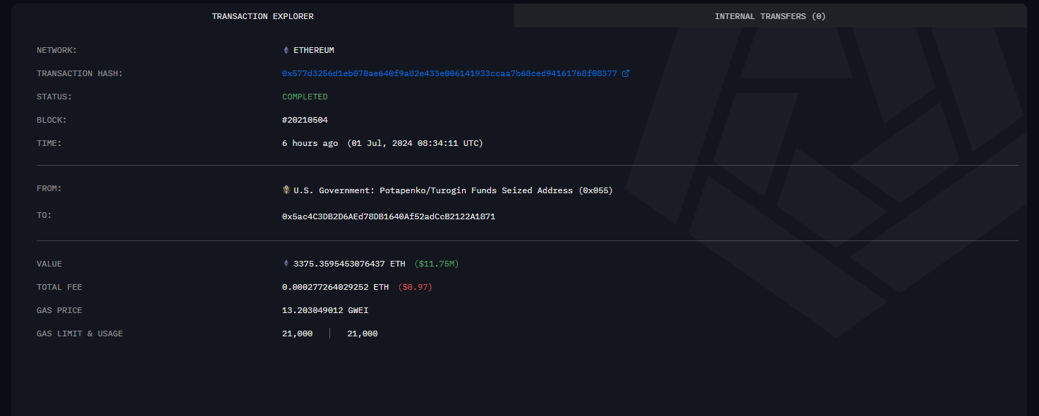 Bugün itibariyle gelen bilgilere göre ABD Hükümeti, lider altcoin Ethereum‘da (ETH) bir transfer gerçekleştirmiş durumda. Elinde toplamda 3.375 adet ETH’si bulunan ABD hükümeti, bu ürünlerin hepsini bilinmeyen bir adrese gönderdi.
