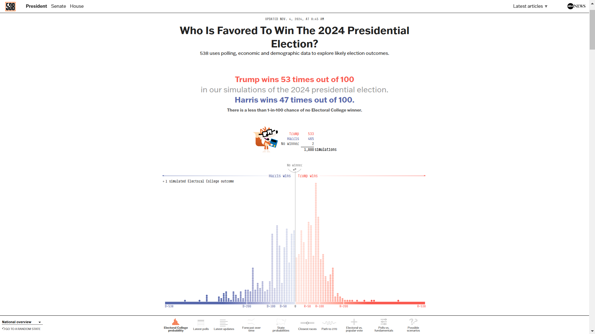 ABC News’in tüm araştırmaları derleyen sonuçlarına göre Donald Trump son 100 önemli anketin 53’ünde önde geldi. Kamala Harris ise 47’sini kazanmış durumda. Bu sonuçlara göre Trump’ın galip gelmesi çok daha olası gibi duruyor.