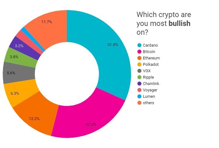 Yatırımcıların en çok bel bağladıkları kripto paranın %31 ile ADA, daha sonra ise %22 ile Bitcoin olduğu görülüyor. Yapılan ankette üçüncü sırada Ethereum, dördüncü sırada Polkadot ve beşinci sırada ise ilginç bir şekilde VGX yer alıyor.