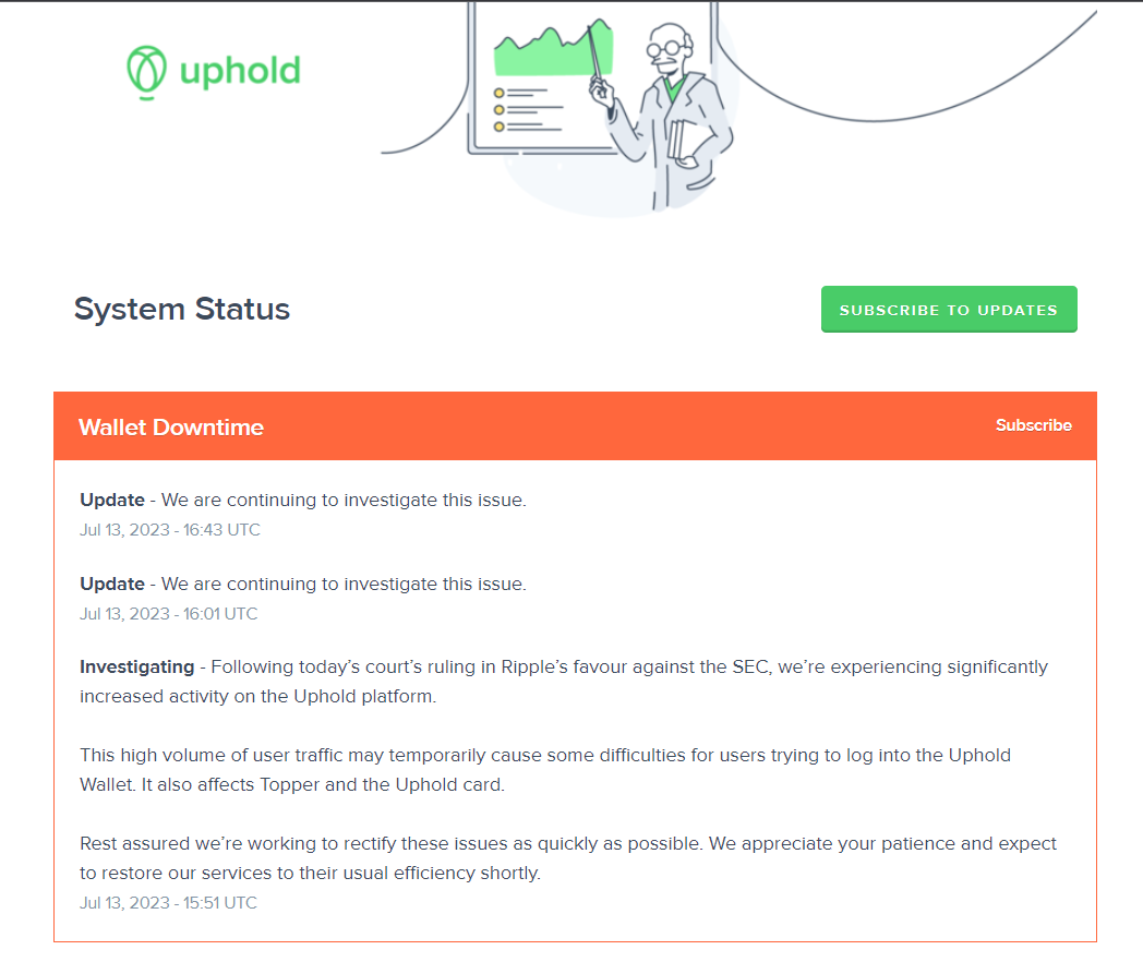 “Bu yüksek hacimli kullanıcı trafiği, Uphold Wallet’a giriş yapmaya çalışan kullanıcılar için geçici olarak bazı zorluklara neden olabilir. Ayrıca Topper ve Uphold kartını da etkiler.”