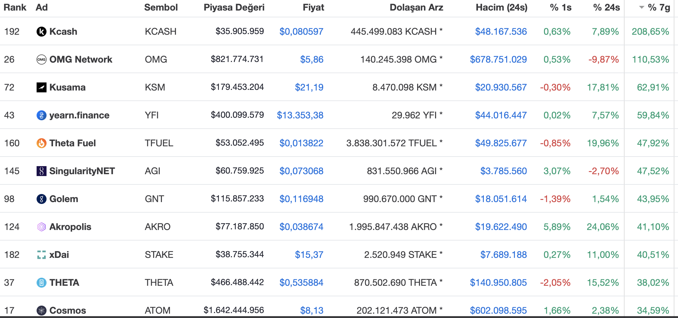 7 günlük kripto para tablosuna baktığımız zaman Kusama adlı bir proje %62 oranında değer kazandığı görülüyor. Huobi kripto para borsasında bakıldığı zaman bu dakikalarda kendisine 21.17 dolardan alıcı bulan bu birimin ardından %59 oranında değer kazanan birimler olduğu görülebiliyor. Özellikle 100’lü sıralarda olan çok sayıda altcoine yatırım yapmak zaman zaman size beklenenden çok daha fazla kazanç getirebilir.