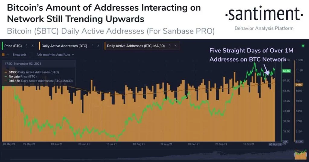 Santiment’in paylaştığı bilgilere göre Bitcoin aktif adres sayısı bu hafta üst üste tekrardan 1 milyon barajını aşmış durumda. Fiyat olarak rekordan rekora koşan Bitcoin’i aktif adres sayıları da desteklemeye devam ediyor.
