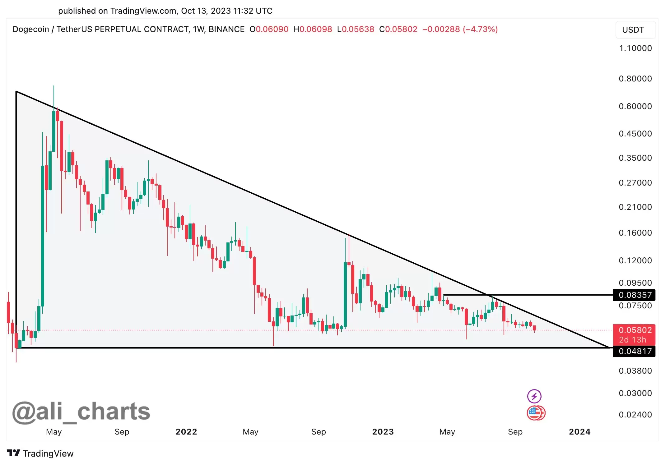 “Dogecoin, büyük bir alçalan üçgen formasyonunun zirvesine yaklaşıyor.