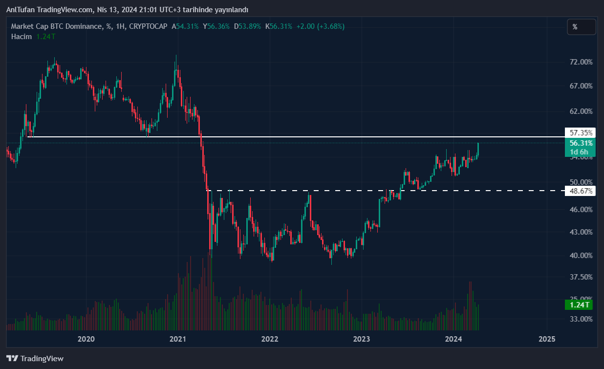 Önümüzdeki günlerde Orta Doğu‘daki savaşın daha da alevlenmemesi halinde BTC dominansının %57 direncinden reddedilip %48 seviyelerine kadar bir düşüş yaşaması bekleniyor.