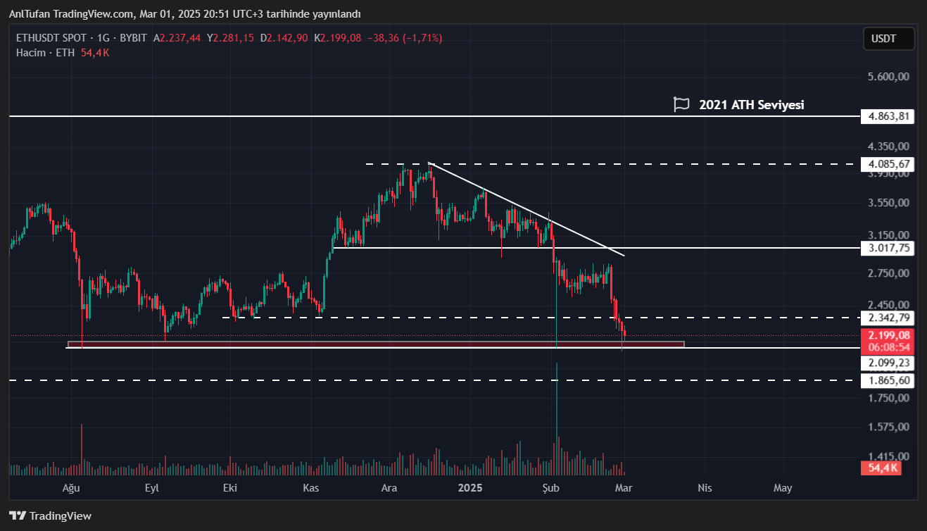 Lider altcoin Ethereum (ETH) haberimizin yazıldığı esnada 2.200 dolar seviyelerinden işlem görüyor. ETH dün özelinde 2.075 dolara kadar gerilemiş ve bir miktar toparlanmış olsa da, yeniden düşüşe geçti.