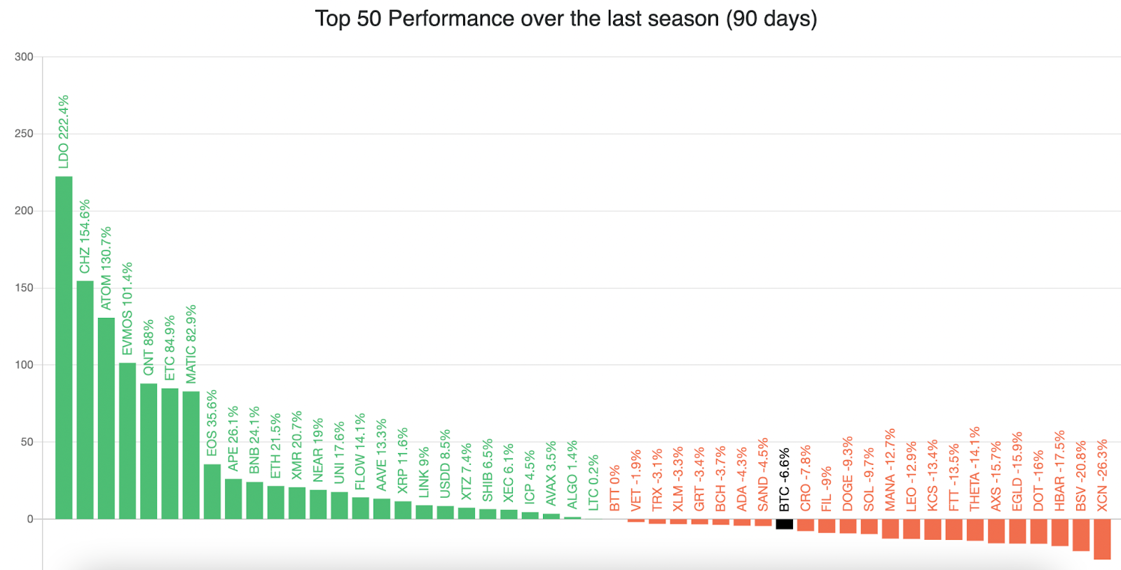 Son 90 gün içerisinde en iyi performansı sergileyen kripto para biriminin ise Lido DAO (LDO) olduğu görülüyor. LDO’nun ardından sonra ise sırasıyla CHZ, ATOM ve EVMOS gelmekte.