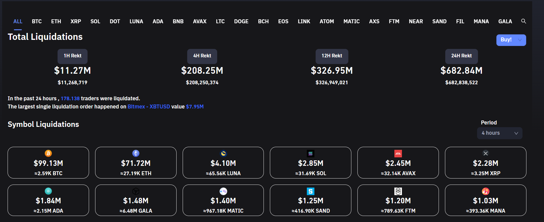 En fazla likit edilen kripto paralarda ise Bitcoin, Ethereum ve Terra Luna bulunuyor.