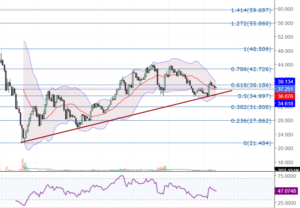 Orta banttan negatif ayrışması satışların ilk etapta trend desteğine kadar sürmesine neden olabilir. 34 seviyesine denk gelen alan güçlü bir destek sayılabilir ve meydana gelebilecek toparlanmalar değerlendirilebilir.