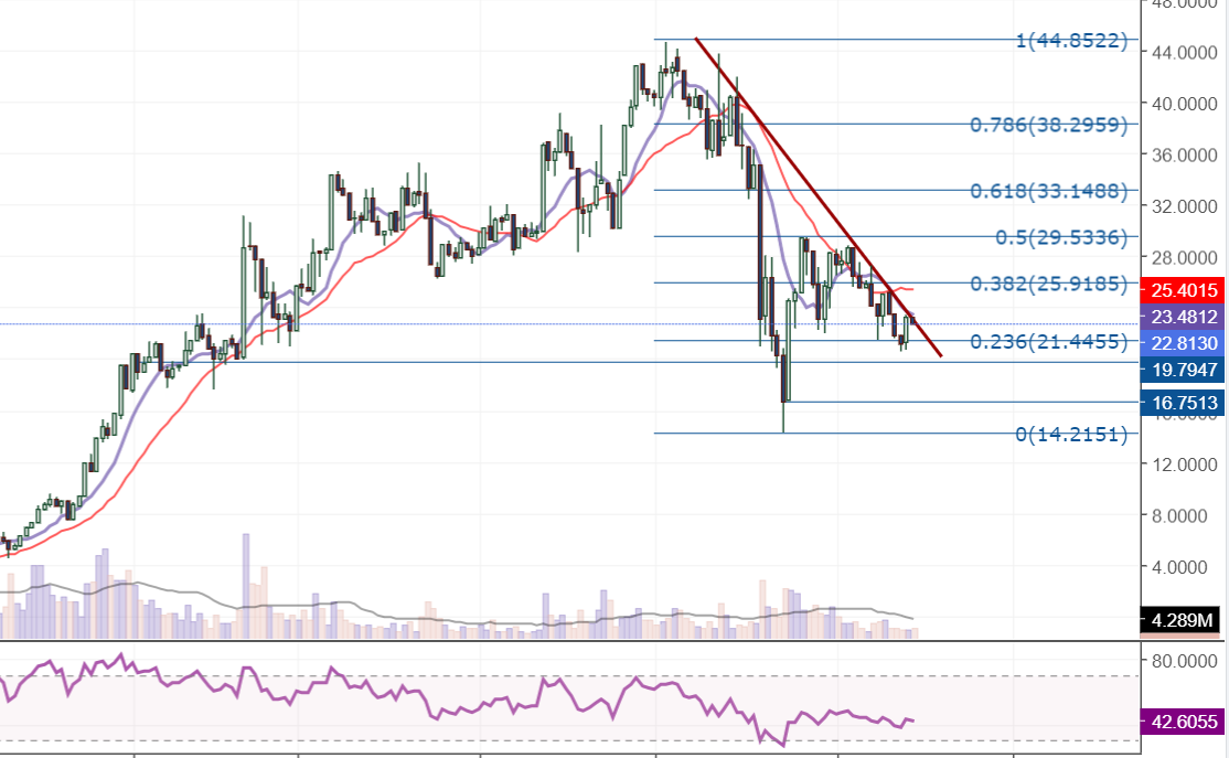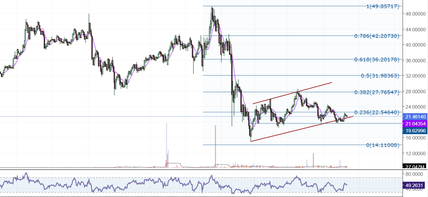 Aşırı satım bölgesine geri dönen ve kanal desteğini test eden DOT/USD’nin 9MA’yı kırması önem taşıyor. 22 direncinden onay alamayan kripto para birimi hareketli ortalamayı ve 22 direncini hacimli bir şekilde kırmayı başarırsa 27 ve 31 seviyeleri takip edilebilir.