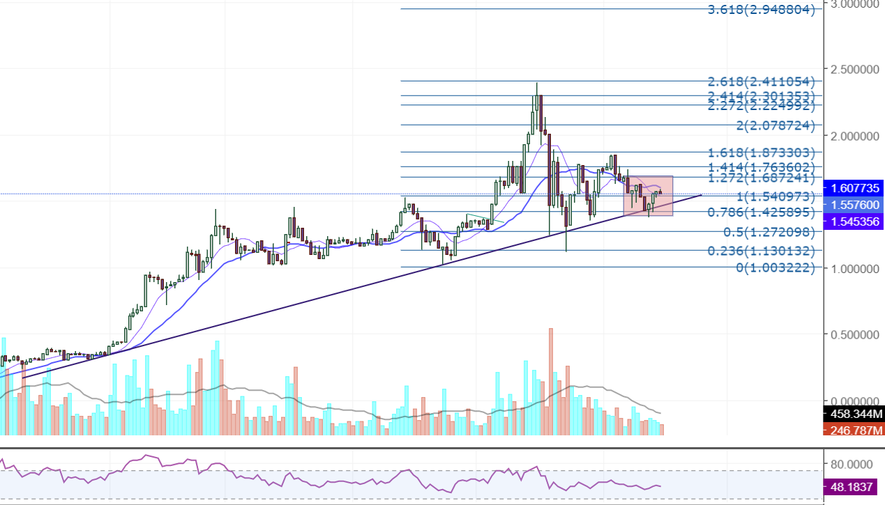 Güçlü bir yükselen trend içerisinde fiyatlamasını sürdüren kripto para biriminin hakimiyet oranı ise bir miktar zayıflamış durumda. 1.42 trend desteğinden toparlamasının ardından ivme kazanan ADA/USD gün içerisinde 1.60 9MA direncini test etti.