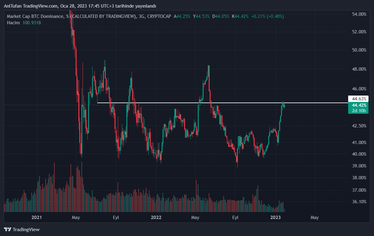 Bitcoin hakimiyetinin yüzde 44.63 direncinden reddedilmesi olumlu olsa da, son günlerde tekrardan yükselişe geçmiş durumda. BTC dominans tablosunun bu seviyenin altında kaldığı sürece altcoin rallisi için her zaman umut bulunmakta.