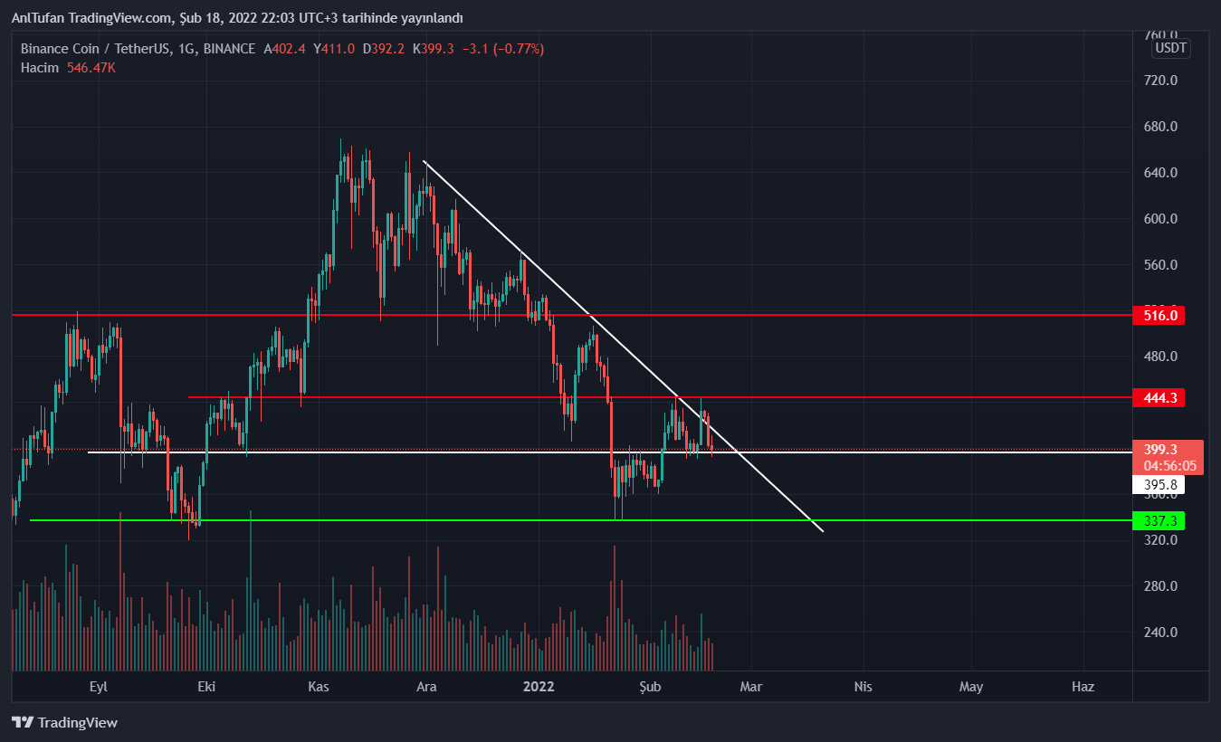 Tekrar düşen trendin altına sarkan BNB, yükseliş için bu trendi kırması gerekiyor. Bitcoin’deki düşüşün sertleşmesi halinde 337 dolar seviyelerine kadar bir düşüş yaşayabilecek olan BNB, bu seviyelerde tekrardan bir dip oluşturabilir.