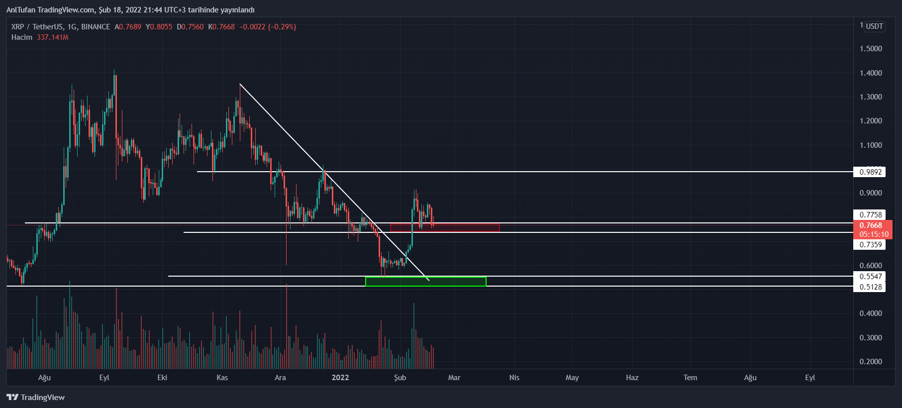 0.7758 – 0.7359 dolar desteğinin kaybedilmesi durumunda çok sert düşüş hareketleri üretmesi bekleniyor. XRP, böyle bir durumda kademeli bir şekilde alt desteklere, bir geri çekilme hareketi gerçekleştirebilir.