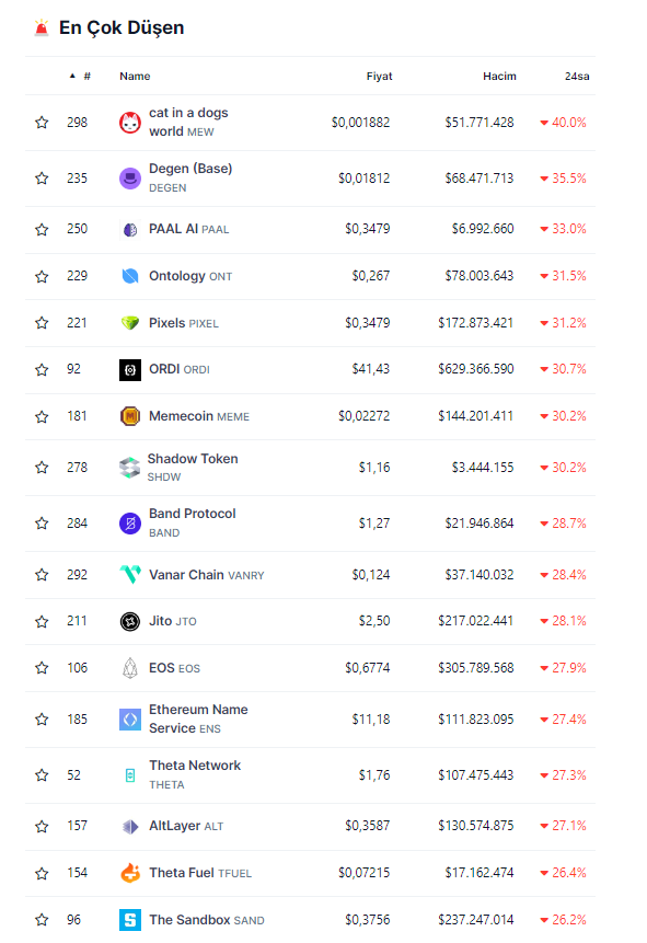 Bugünün en fazla düşüş yaşayan altcoin’lerini merak eden okurlarımız, aşağıda yer alan listeyi inceleyebilir: